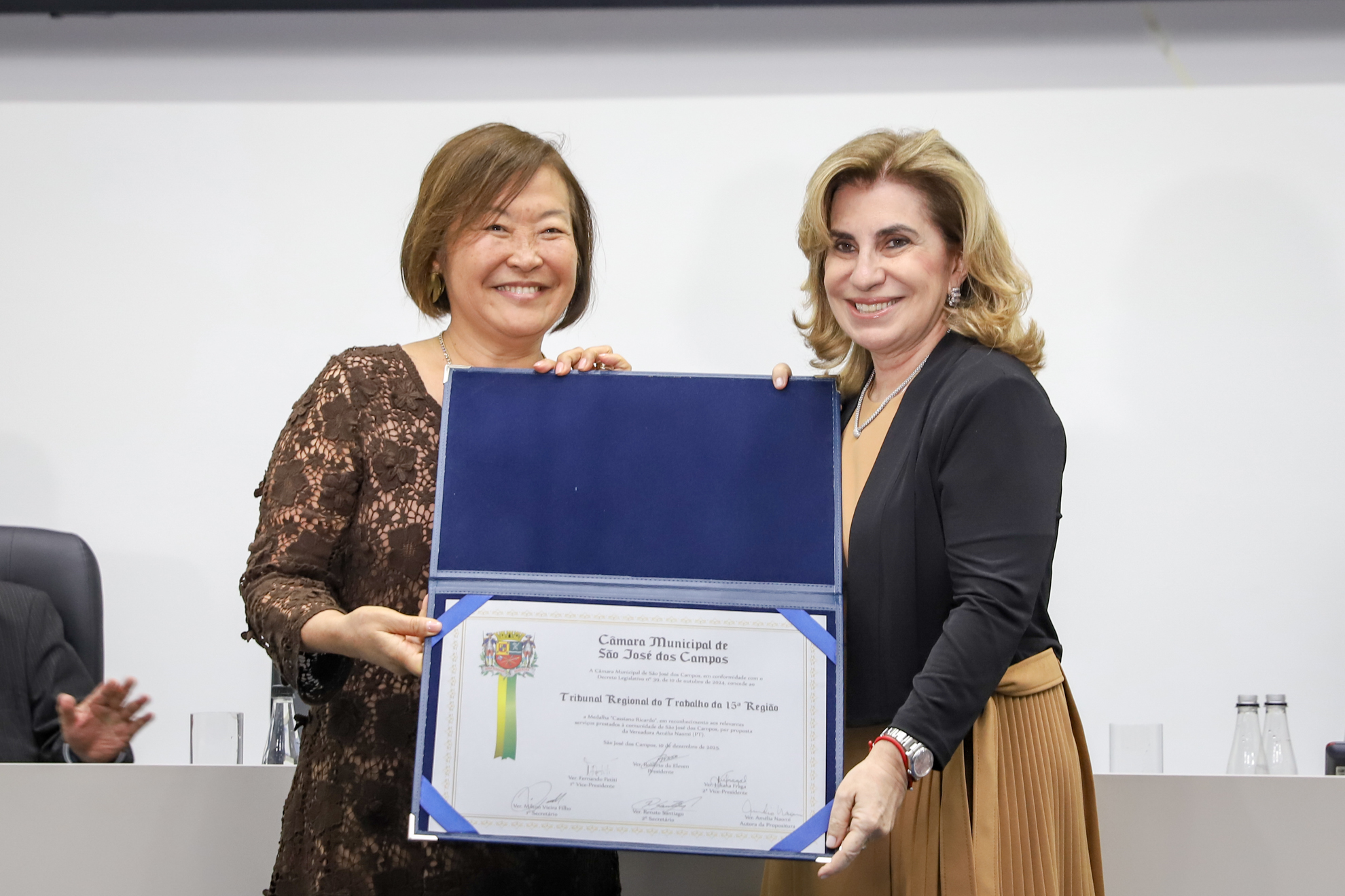 Em sessão solene realizada nesta quarta-feira, 10/12, data em que se celebra a Declaração Universal dos Direitos Humanos, a Câmara Municipal de São José dos Campos concedeu ao Tribunal Regional do Trabalho da 15ª Região a Medalha Cassiano Ricardo, honraria destinada a pessoas e entidades que se destacam pela relevância dos serviços prestados à comunidade joseense. A presidente do Tribunal, desembargadora Ana Paula Pellegrina Lockmann, recebeu a homenagem em nome do TRT-15.