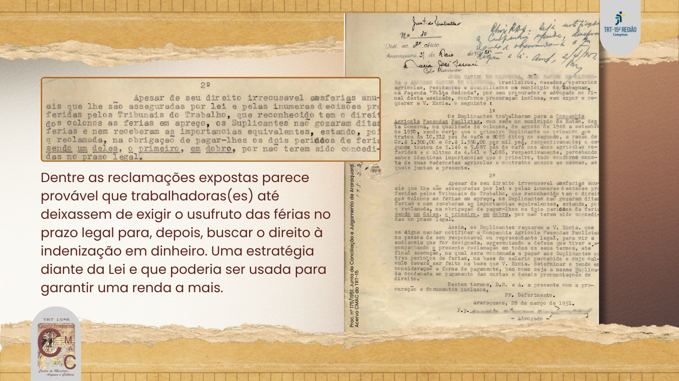 Os “1OO anos da Lei de Férias – Decreto nº 4.982/1925: um marco das relações trabalhistas no Brasil” é o tema da exposição virtual permanente organizada pela Coordenadoria de Gestão Documental do Centro de Memória, Arquivo e Cultura (CMAC) do Tribunal Regional do Trabalho da 15ª Região, e que mostra a evolução das férias como instrumento de reivindicação trabalhista. A exposição, em seu módulo virtual, deverá permanecer na página do CMAC, e a presencial poderá ser visitada no espaço do CMAC, no quarto andar do edifício-sede judicial do TRT-15. As visitas poderão ser feitas aqui a partir desta sexta-feira, 28/11.