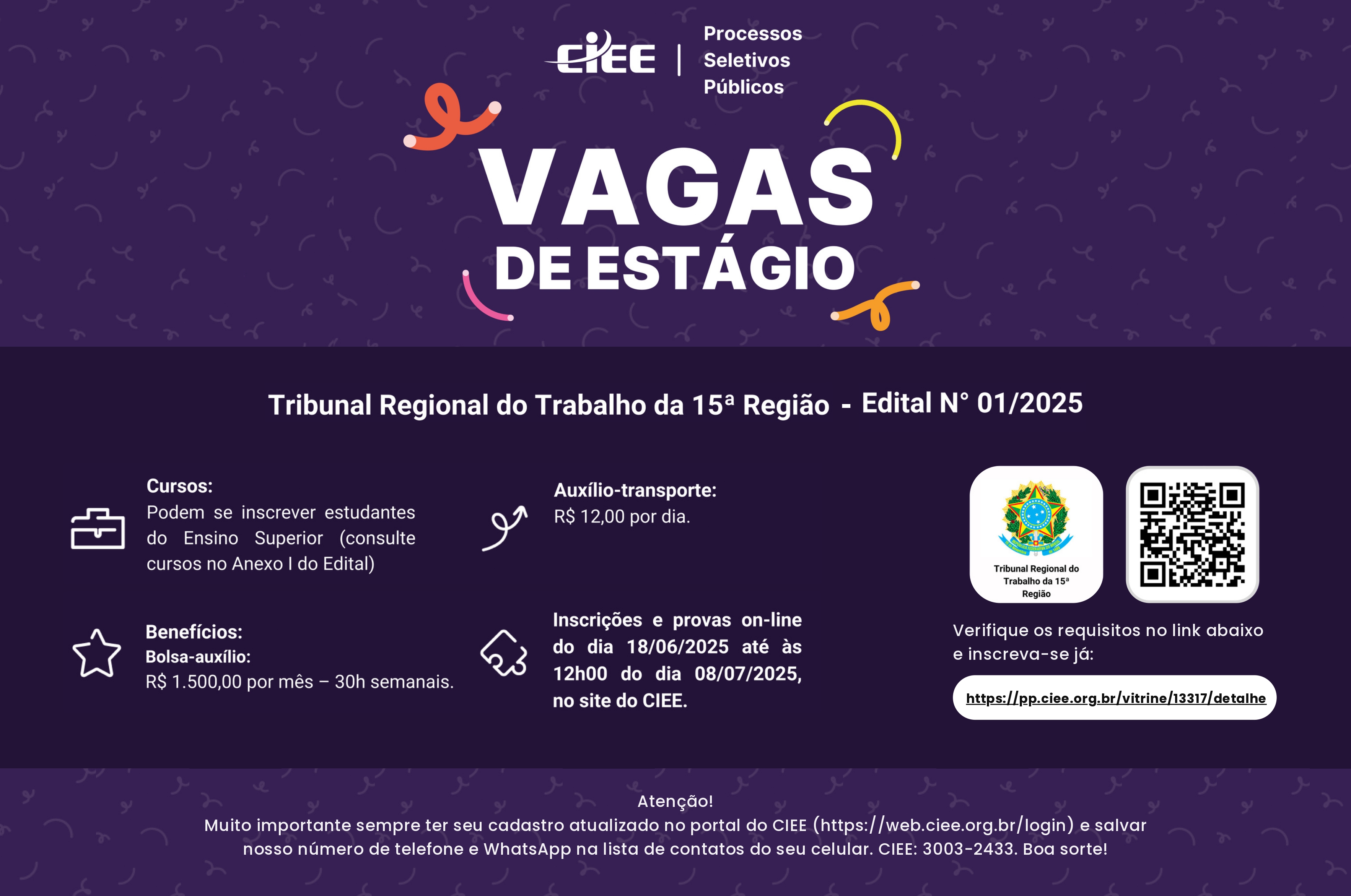 O Tribunal Regional do Trabalho da 15ª Região está com inscrições abertas para processo seletivo destinado à formação de cadastro reserva de estagiários de nível superior. A seleção é voltada a estudantes regularmente matriculados em instituições de ensino públicas ou privadas, envolvendo os cursos de Administração de Empresas, Arquitetura, Biblioteconomia, Ciências Contábeis, Ciências Econômicas, Comunicação Social (Jornalismo, Midialogia, Multimídia, Publicidade e Propaganda, Rádio e TV, Relações Públicas), Design Gráfico, Direito, Engenharia Civil, Fisioterapia, Fotografia, História, Pedagogia e Produção Audiovisual.