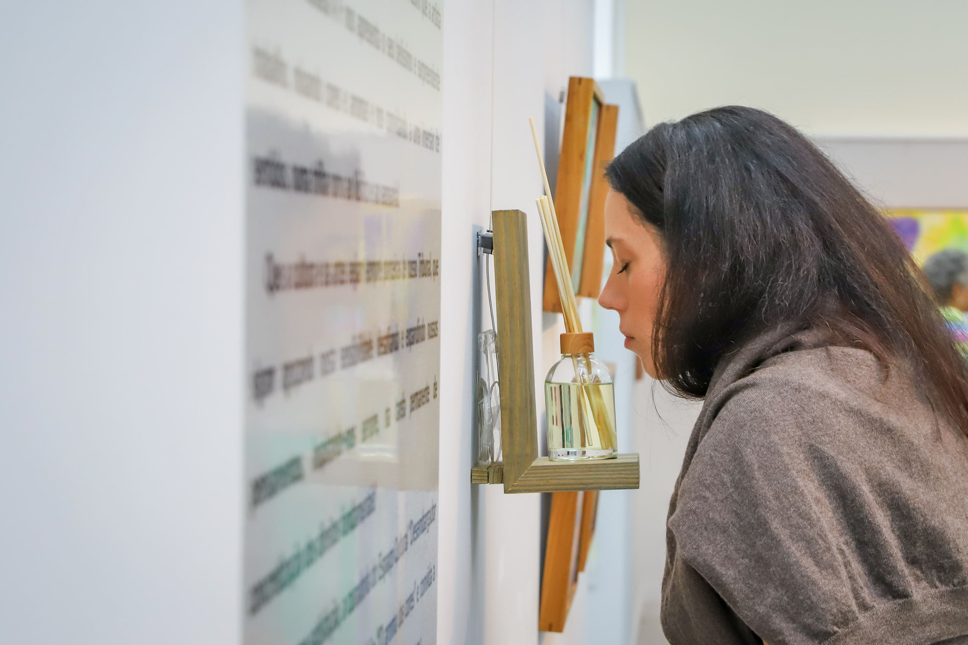 Aos visitantes do Espaço Cultural para essa exposição, a artista elaborou um singelo desafio sensorial, que os convida a aliar observação visual de algumas telas, percepção do perfume de óleos essenciais guardados em difusores dispostos no ambiente e imaginação livre para relacionar o ato de “comer e cheirar a obra. Que cheiro ela tem?”, desafia a artista.